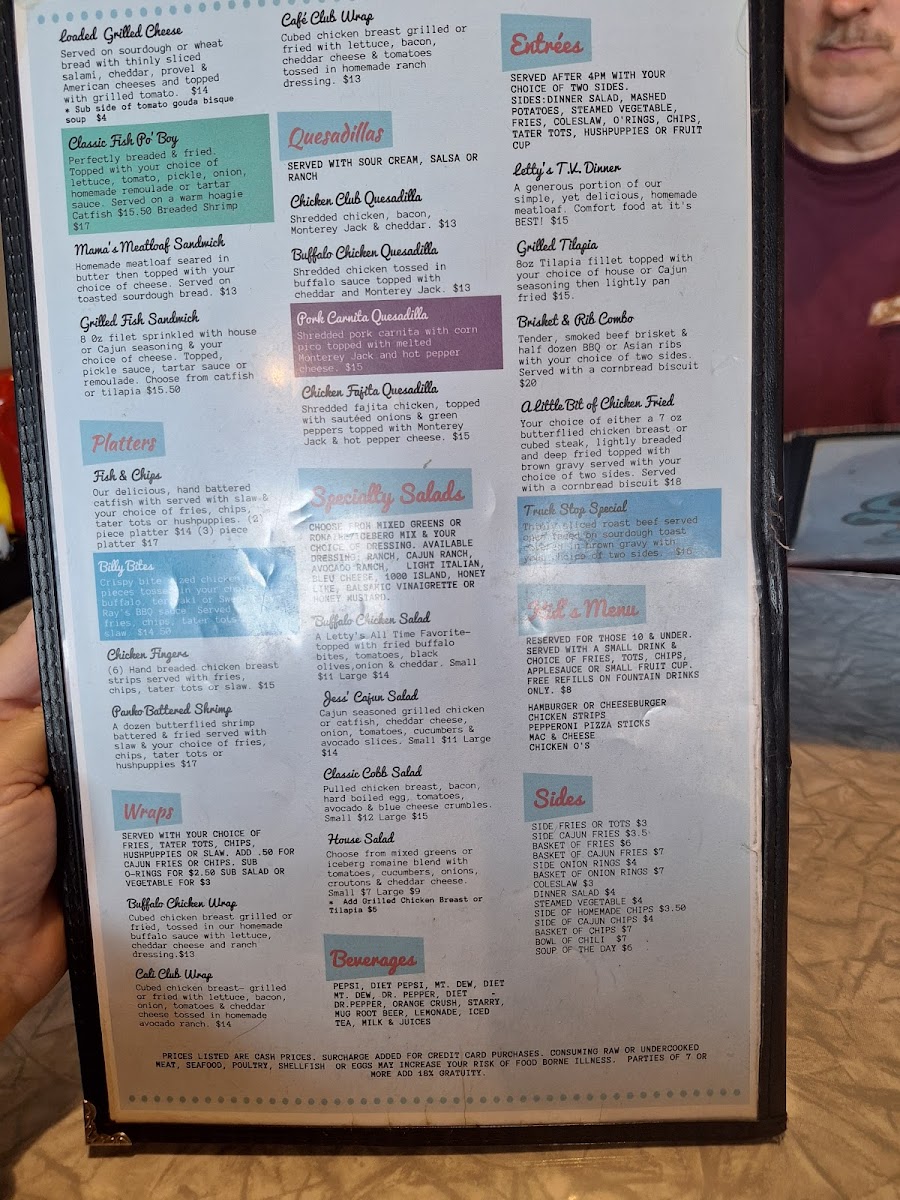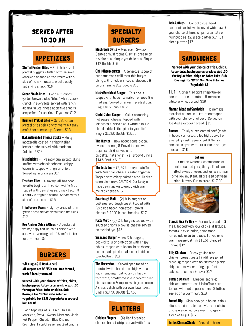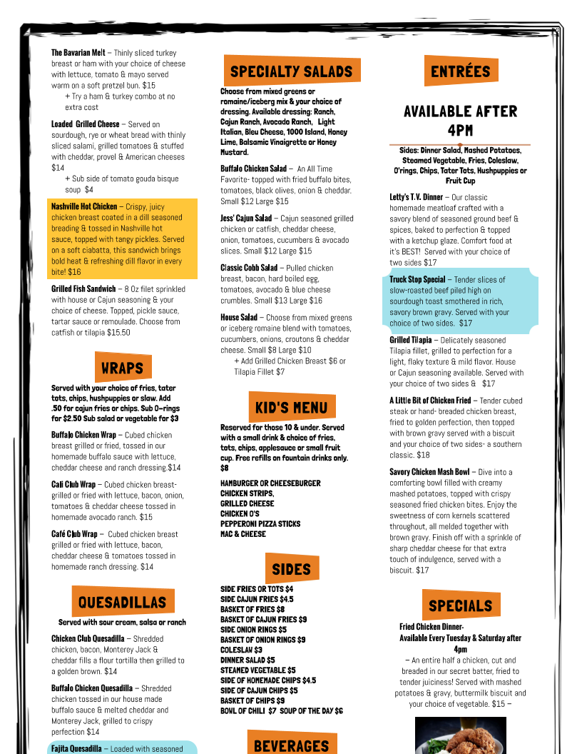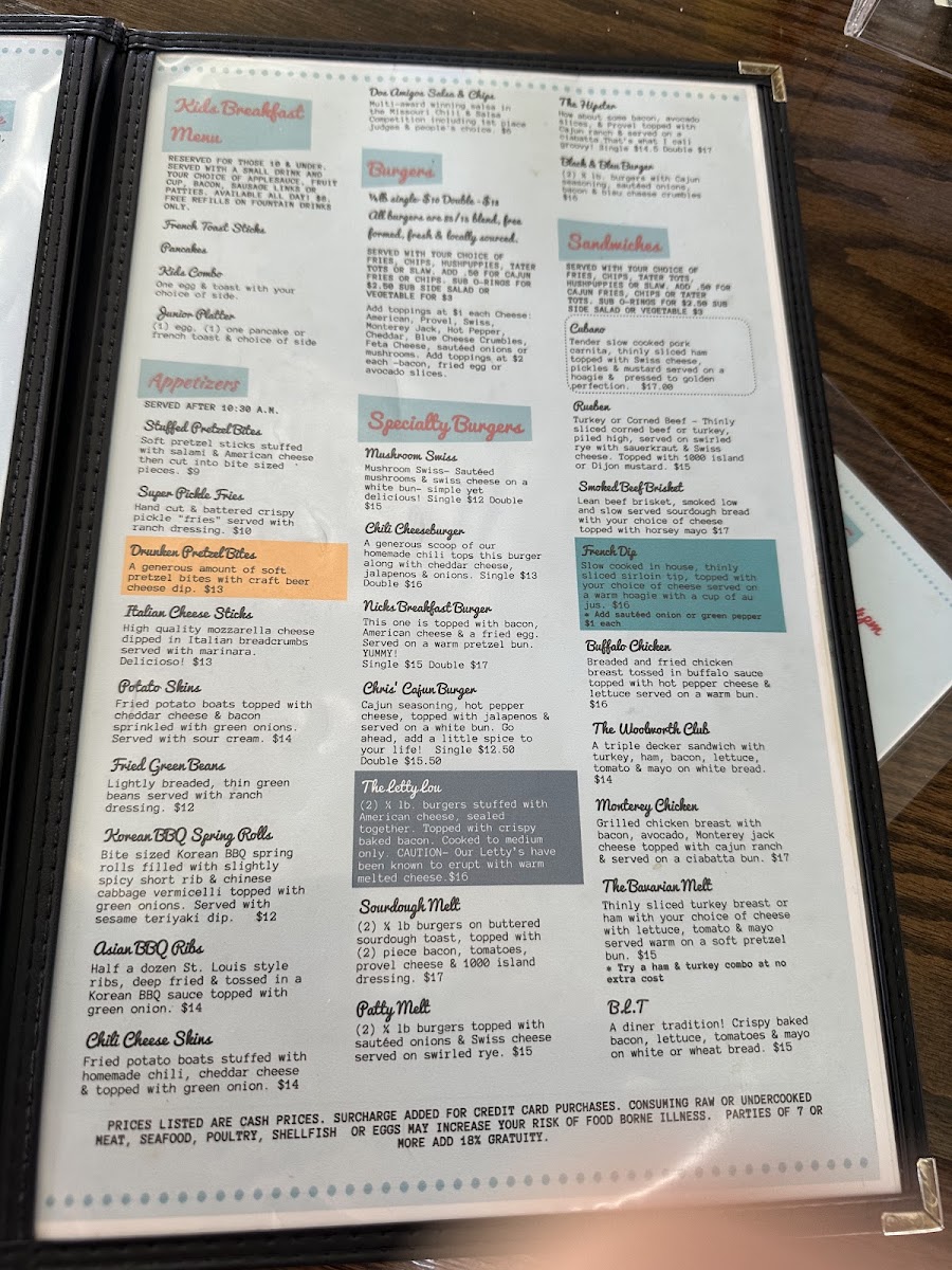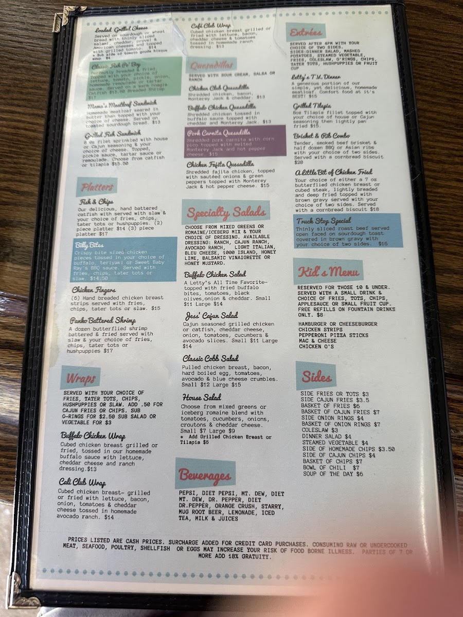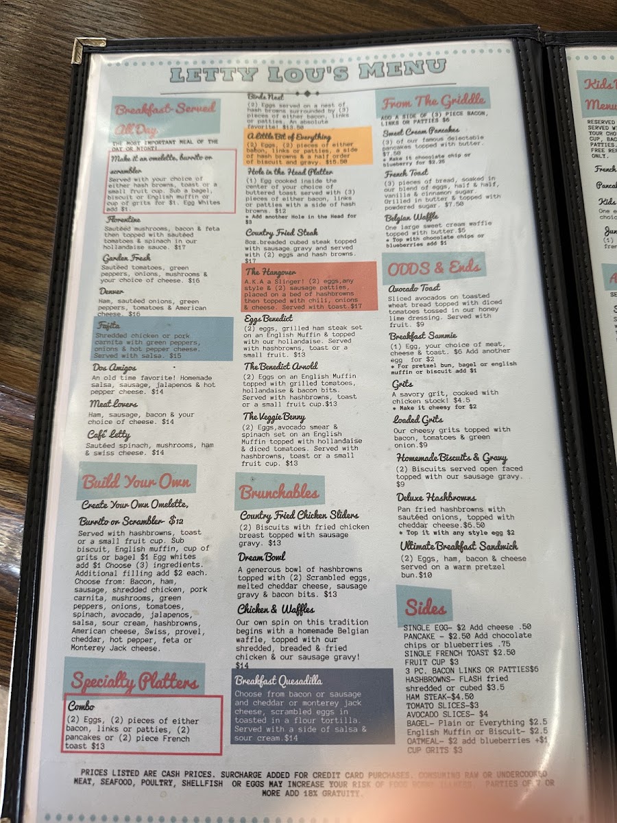 The menu at Letty Lou's Café & Diner features a variety of American-style dishes suitable for breakfast, lunch, and dinner. It includes a range of specialty platters, classic breakfast options, sandwiches, and light meals that can accommodate different meal preferences throughout the day.