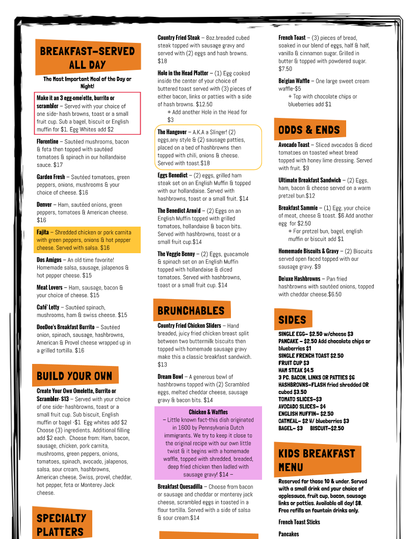 - Kids’ Breakfast Menu: Smaller portions tailored for children 10 and under, with options like French Toast Sticks and Pancakes, served with a small drink and a choice of sides such as applesauce or sausage links.