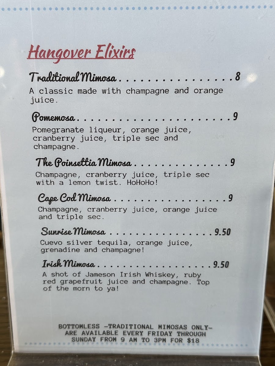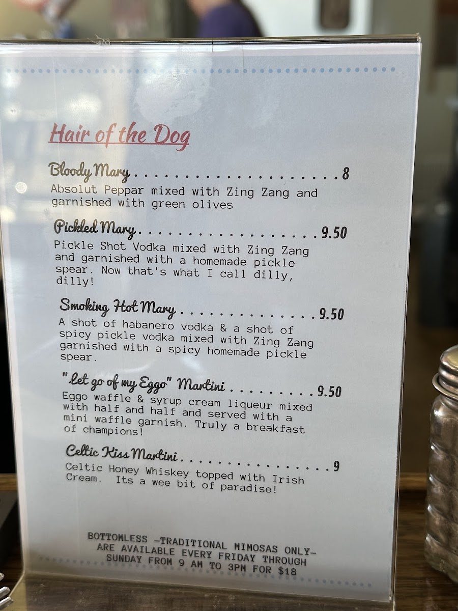 - Beverages: A selection of drinks is available, including mimosas and specialty cocktails like Pickled Bloody Marys, suitable for both breakfast and casual dining.